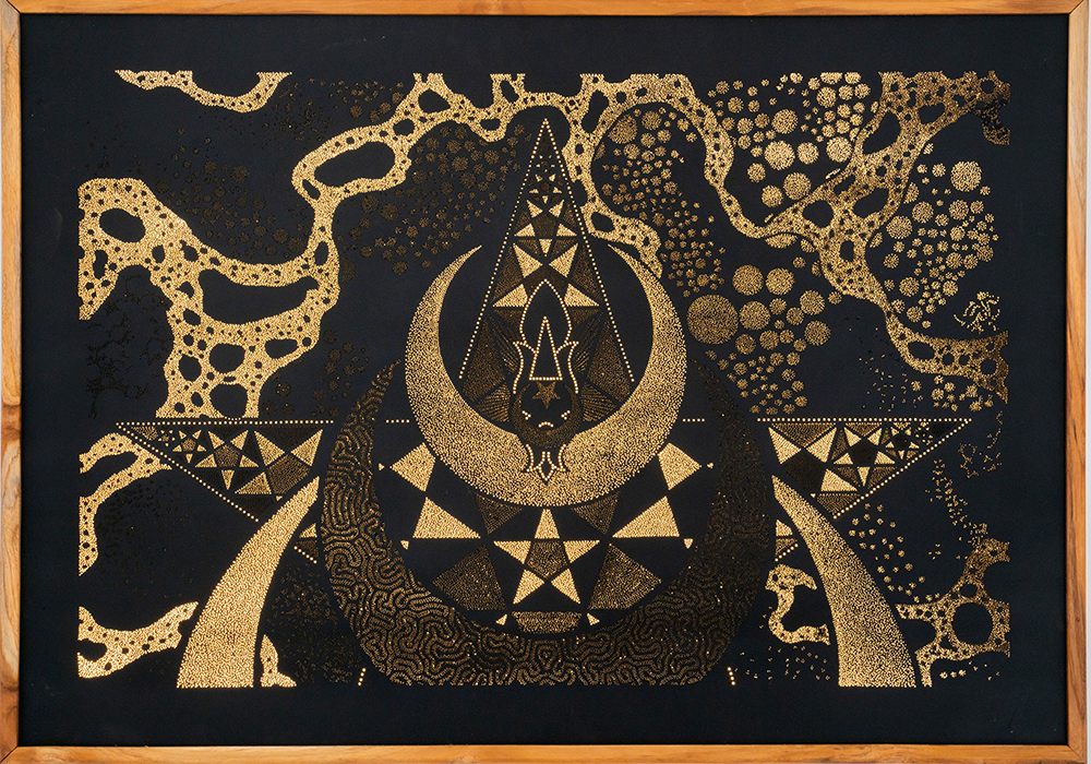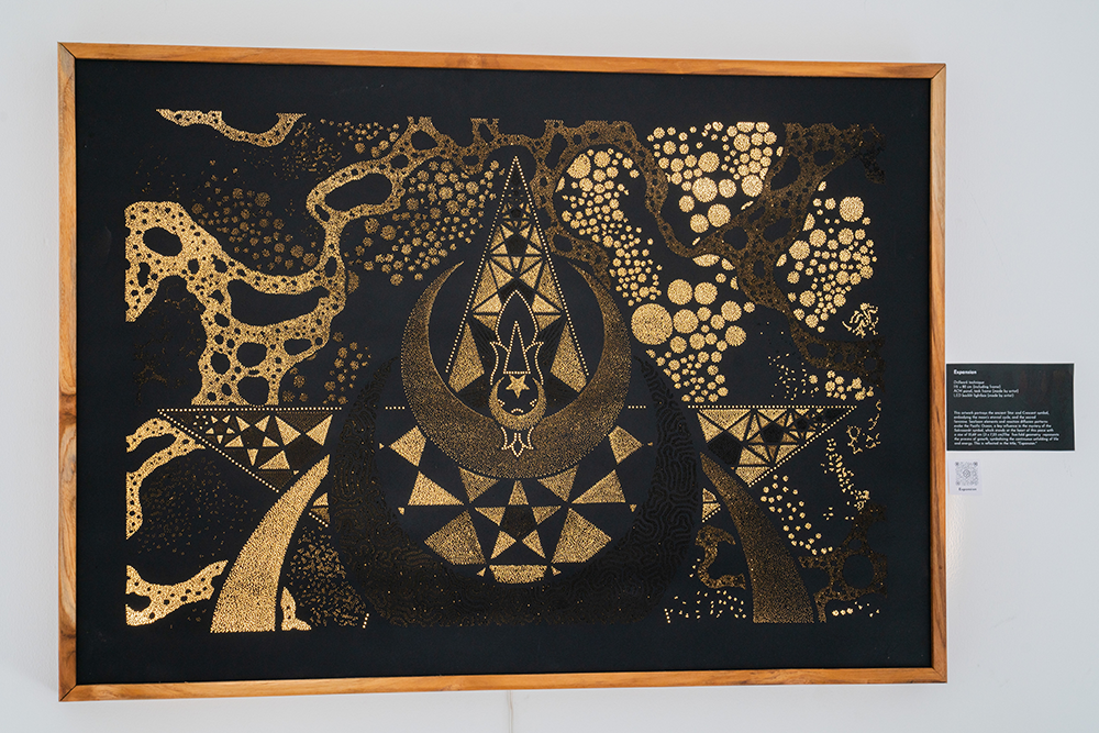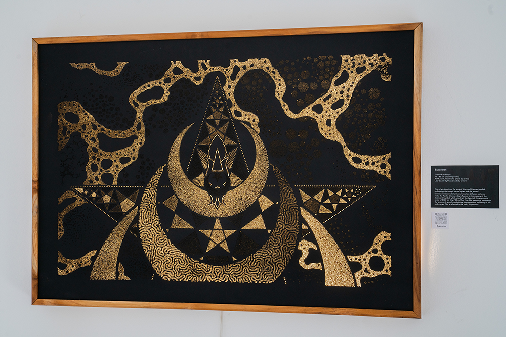 This artwork portrays the ancient Star and Crescent symbol, embodying the moon’s eternal cycle and the sacred feminine. Seafoam elements and reaction diffusion patterns represent the Pacific Ocean, a key influence in the Sakrosankt symbol, which stands at the heart. The five-fold geometry symbolizes growth, representing the continuous unfolding of life and energy. This is reflected in the title, “Expansion.”6500