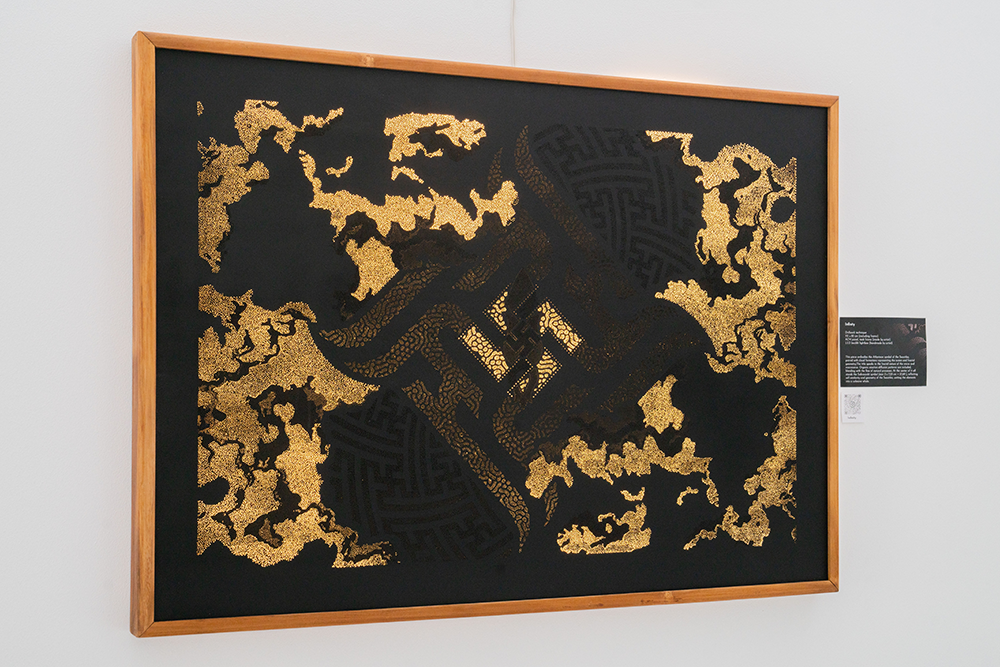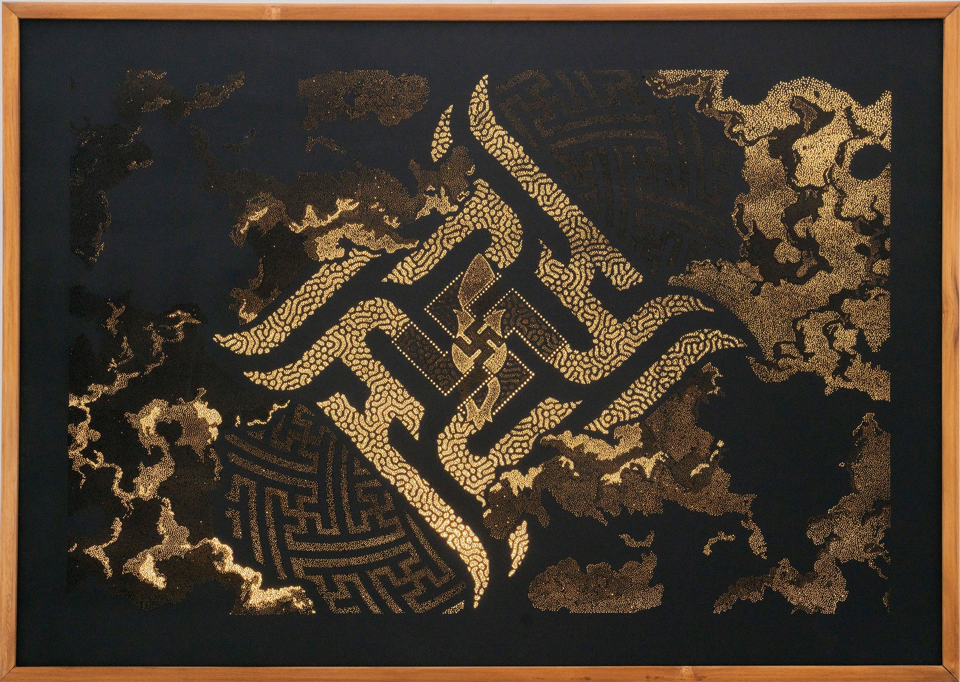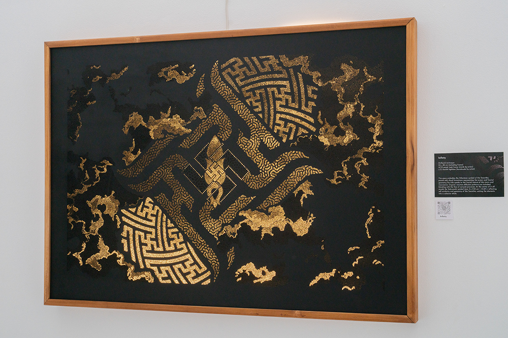 This piece embodies the Atlantean symbol of the Swastika, paired with cloud formations symbolizing the sky over the ocean. The title speaks to the fractal nature of the micro and macroverse. Organic reaction-diffusion patterns are included, blending with the flow of natural processes. The centered Sakrosankt symbol reflects self-similarity. Behind the Swastika, the spiral movement of the Universe.